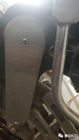 獅邁的五軸聯(lián)動(dòng)水刀在切割厚材料時(shí),軟件會(huì)自動(dòng)調(diào)整A、B軸錐角,異物在設(shè)備工作時(shí)會(huì)滲進(jìn)B軸耐磨片而導(dǎo)致切割精度下降,拍下“急?!辨I,卸掉圖8中B軸擺臂護(hù)板上的兩個(gè)螺絲,再用WD-40清洗耐磨片和軸承并清除里面的異物,用手緩慢來回重復(fù)推動(dòng)切割頭,裝好蓋板后壓緊螺絲。