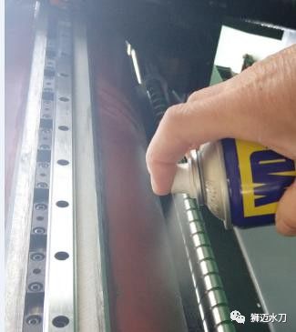 卸掉圖5 中X、Y 軸滑座風(fēng)琴罩兩邊的固定板,用圖6 中的WD-4 0清洗絲桿和線軌,再用清潔布把絲桿和線軌的臟物擦掉,并用下圖7 中的方法對X、Y 滑座加潤滑脂,對X、Y 軸滑座兩邊的接觸面均勻涂上防水膠,最后壓緊風(fēng)琴罩固定板。
