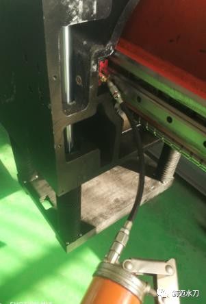 卸掉圖3 中Y 軸立柱3 個(gè)壓緊風(fēng)琴罩的固定螺絲,用WD-4 0噴霧清洗劑清洗齒條、線軌,并用清潔布把臟物清除,再按照圖4方法用黃油槍將Y軸2 個(gè)立柱的4個(gè)滑塊加上潤滑脂,當(dāng)看到潤滑脂從滑塊縫隙中流出即可,來回運(yùn)動(dòng)多次后裝好Y軸風(fēng)琴罩壓緊條。